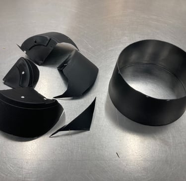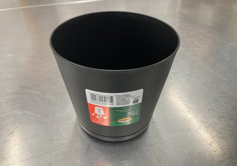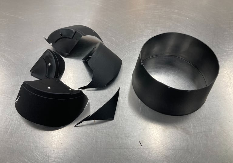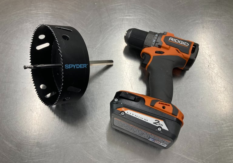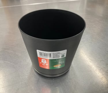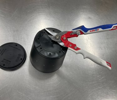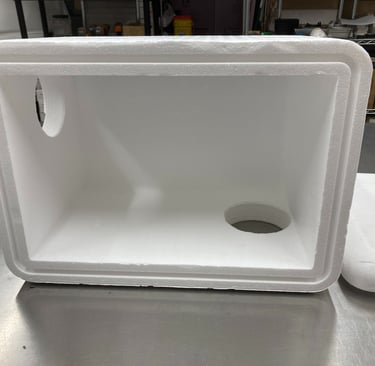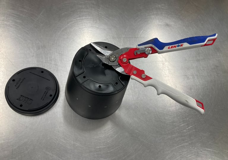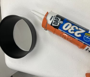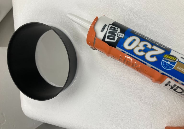 Either one or two holes are cut or drilled into it. A second hole provides an escape path if the cats encounter any predators, but it will not hold the heat as well. The holes are placed off to the side as shown, as this allows maximum space inside. The holes should be about 5 to 6 inches round, and can be cut with a sharp paring knife or drilled with a hole saw. Be sure to do this outside, because the styrofoam dust becomes a mess, especially if using a drill. Use compressed air or a leaf blower to clean away the dust. This is optional, but six inch plastic flower pots can be cut to make a durable entrance and awning. Because they are tapered, they can be pressed into the holes firmly. 100% silicone is then used to secure the pots.
