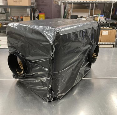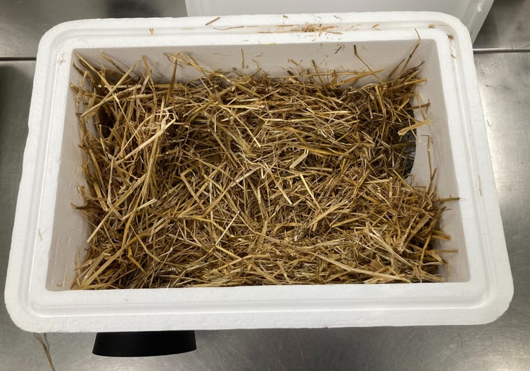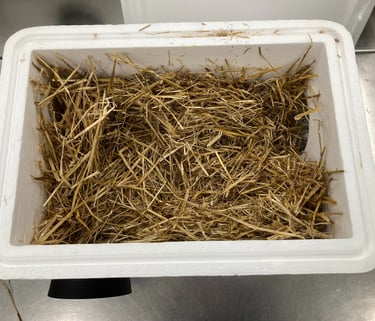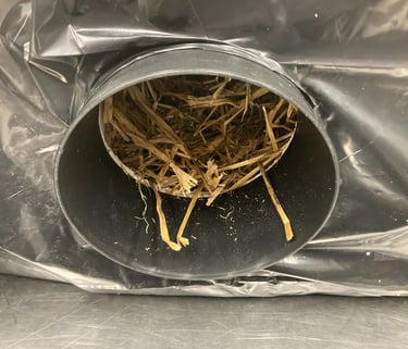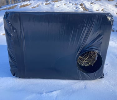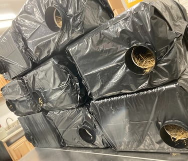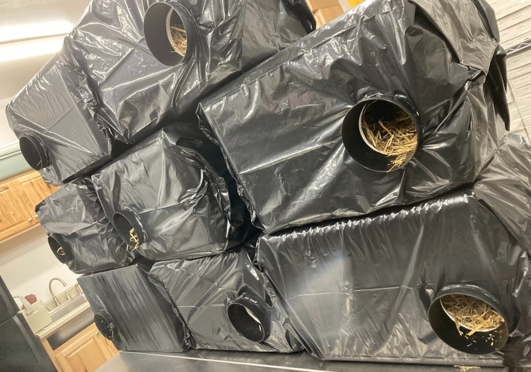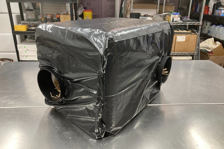 Straw is used to provide bedding and additional warmth. Do not use hay or blankets because they will hold moisture and freeze. Spread the straw loosely across the floor to a depth of three or four inches. Then pack some around the walls to create a nest. Replace the lid and pull a contractor grade trash bag over the cooler. 42 gallon bags usually work well, but some coolers that are larger may require a 55 gallon drum liner. Cut the bag where the flower pots are located, and then fold and tape any flaps, like wrapping a present. Black all-weather duct tape is the best option, as it will last longer and look nicer.